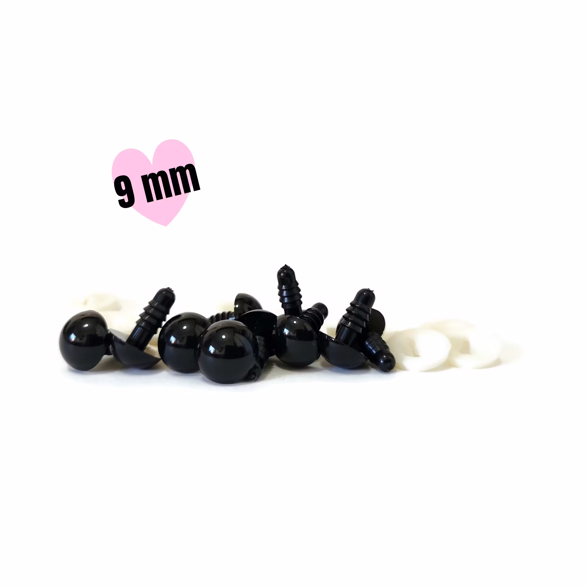 10 st (5 par) säkerhetsögon i storlek 9 mm (+ 10 stycken säkerhetsbakstycke, de vita som syns på bilden).