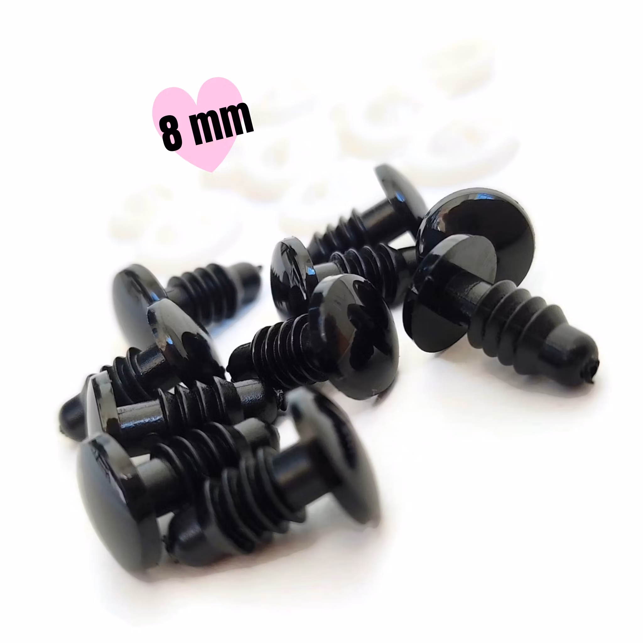10 st (5 par) säkerhetsögon i storlek 8 mm (+ 10 stycken säkerhetsbakstycke, de vita som syns på bilden).