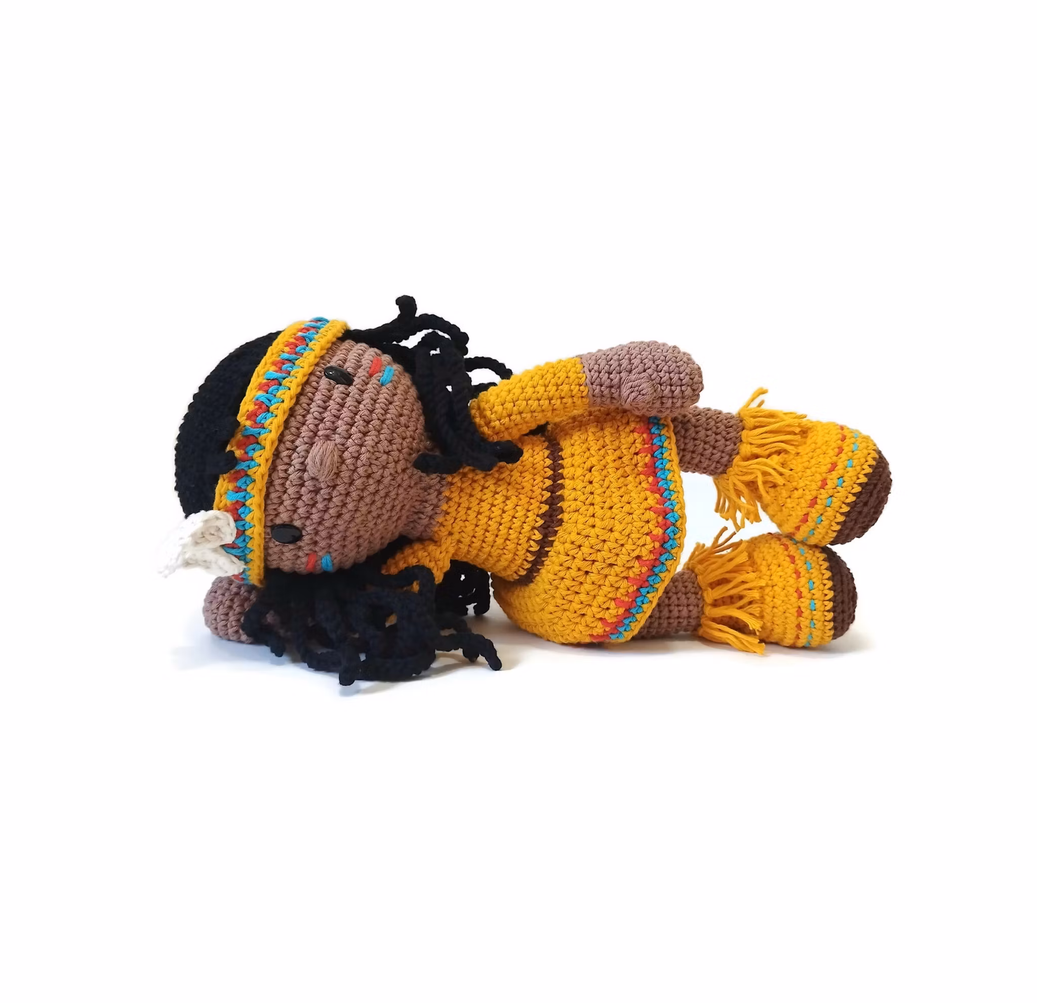 - Bomullsgarn anpassad för virknål större än den du använder. Jag använder 8/8 bomullsgarn, ”Yarn and colors – EPIC” + virknål 4 mm. Garnåtgång: Hudfärg (Teak 008) 85 gram, vitt (Cream 002) 25 gram, gult (Mustard 015) 85 gram, brunt (brunet 027) 15 gram, rött (Peppar 032) 10 gram, turkos (turquoise 065) 10 gram samt svart (Black 100) 70 gram.
